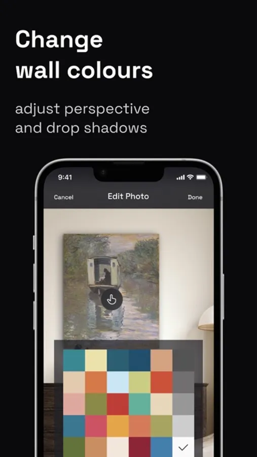 Upload your own photo of an interior space and display your artwork in it. Change wall colour and adjust perspective and drop shadows for a realistic look.