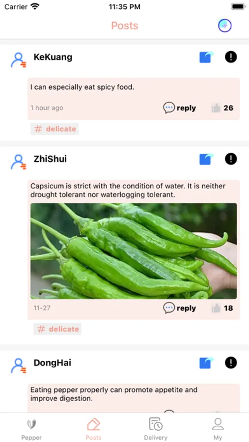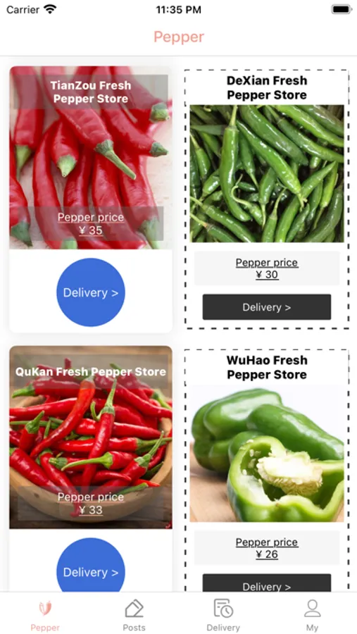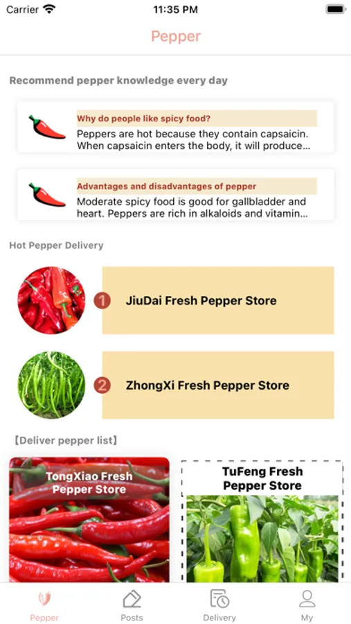 This is an application for delivering pepper. In order to bring a better experience to people who love pepper, we have many pepper stores to deliver, including green pepper and red pepper. Go to deliver. We also have the post function, which allows you to comment and post.