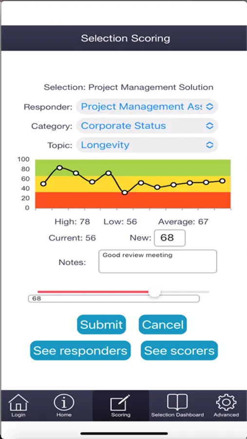 LR-Sel streamlines the process of selecting between competing bidders in a selection or procurement process. The online realtime scoring process cuts down selection team meetings, avoids multiple copies of spreadsheets being passed around between the team, allows additional experts to be brought in to score on specialist areas and allows team principles to quickly identify outlier opinions. Finally, a record is kept of the decision making process that can be examined after the decision has been made. This ensures that the winning bidder can be held to commitments they have made in the bidding process and will inform further future procurement exercises. It is part of the LionRidge MSI methodology (Maximising Strategic Investments)
