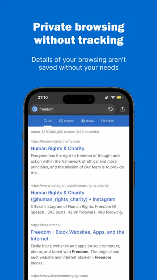 The privacy-based search engine, Freedom, also offers a privacy-first mobile browser. This browser blocks trackers and assigns each website a privacy score, providing a transparent view of what each site does or tries to do with your data.