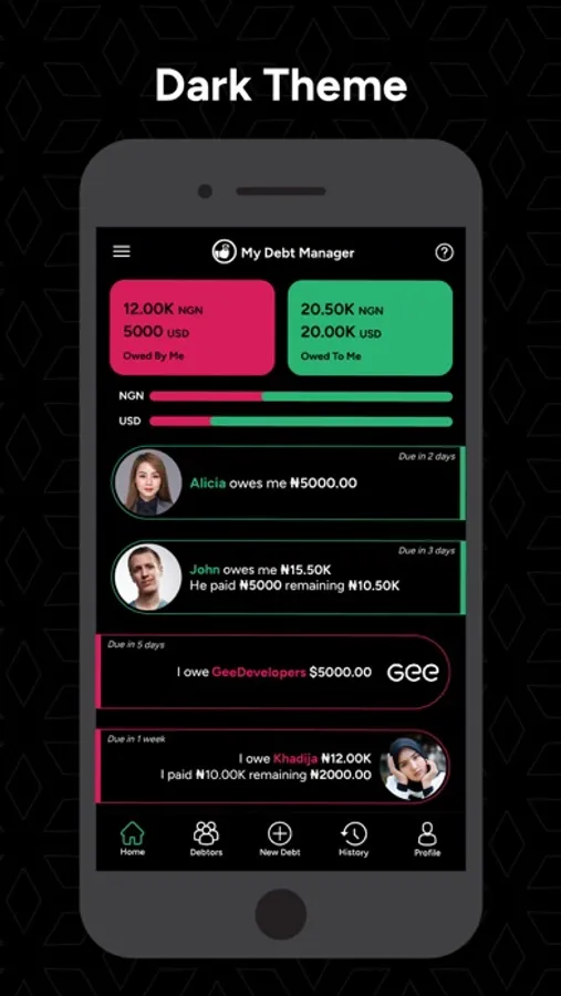Reminder Notifications: Receive timely reminders for upcoming and overdue debts via notifications.