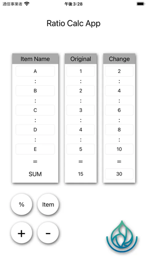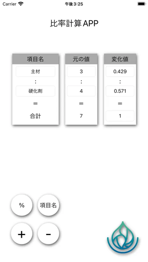 「例えば2液を混合する塗装材料の場合、規格が主材3kgと硬化剤4kgの材料を1kg分作りたい時、元の値に規格を入力し、変化値の合計のセルに作りたい値を入力すれば、必要な主材、硬化剤それぞれの値が表示されます。」