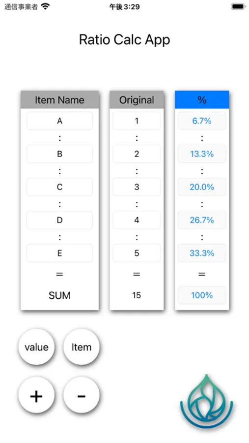 %ボタンを押すと、それぞれの値が何%なのか表示されます。