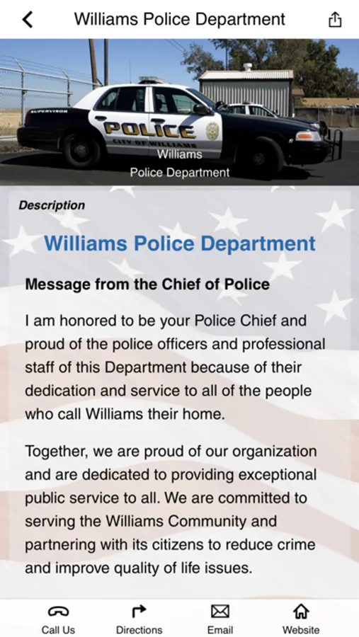 This app is for the employees of the Williams Police Department, their families, and the community they serve. This app contains information about the department as well as safety and crime prevention tips. The WPD's employees and their families will have access to a full range of wellness tools.