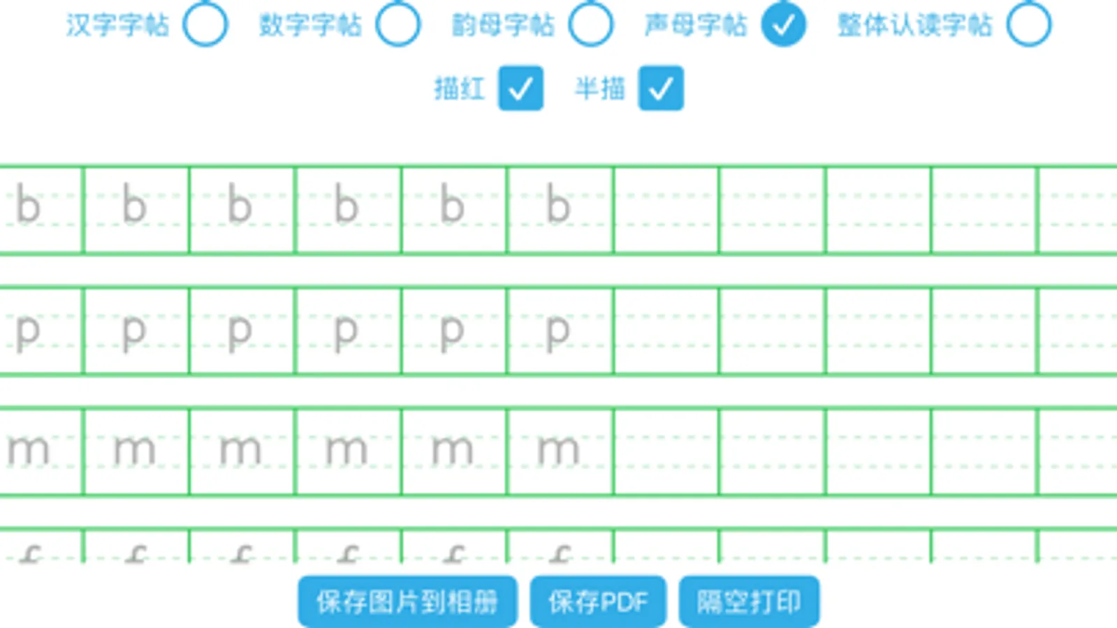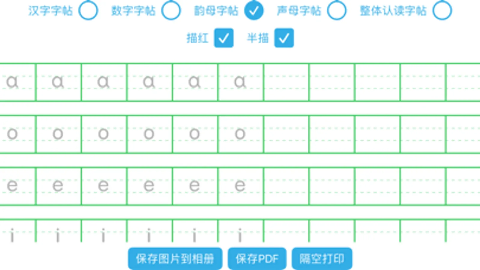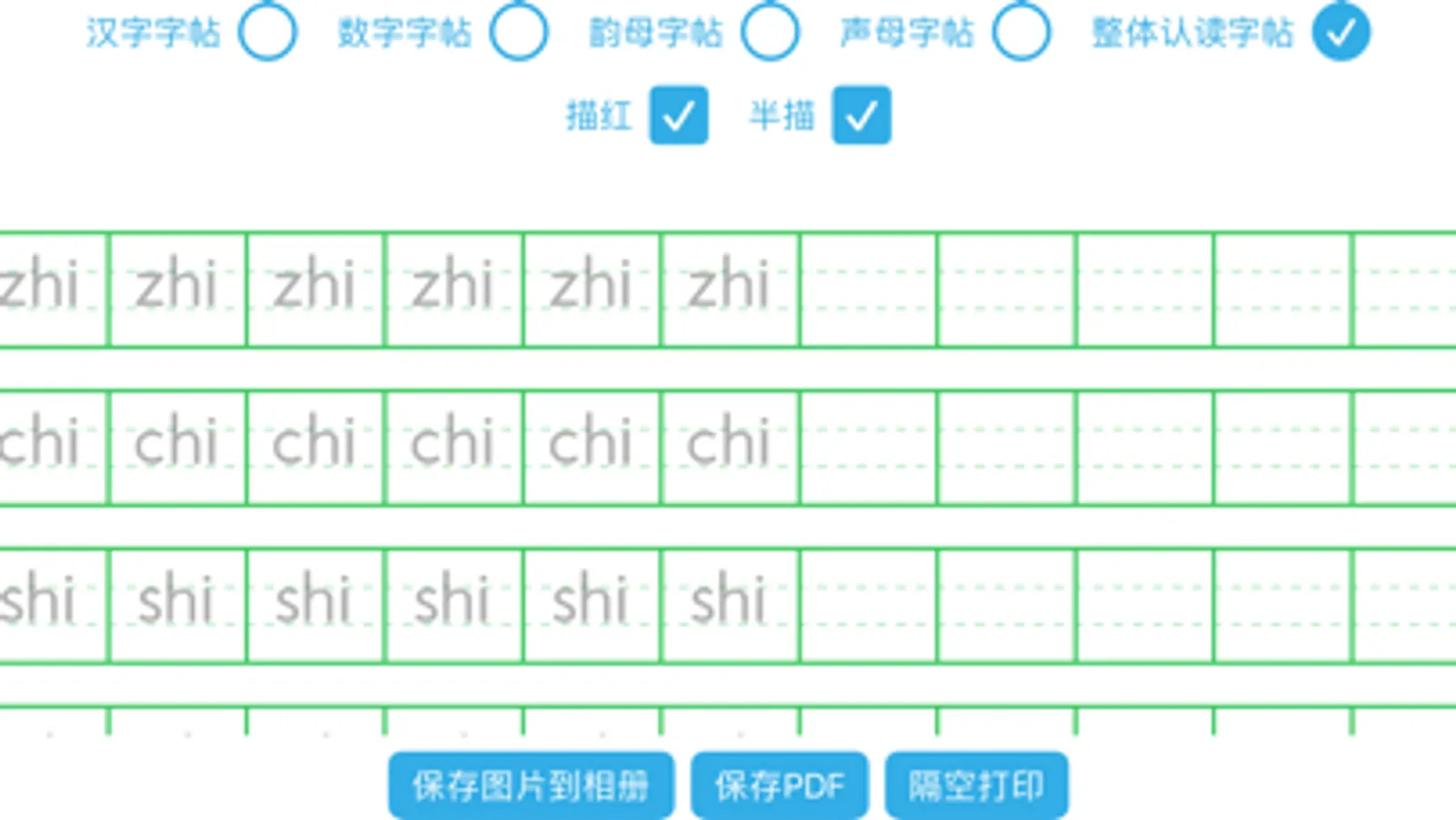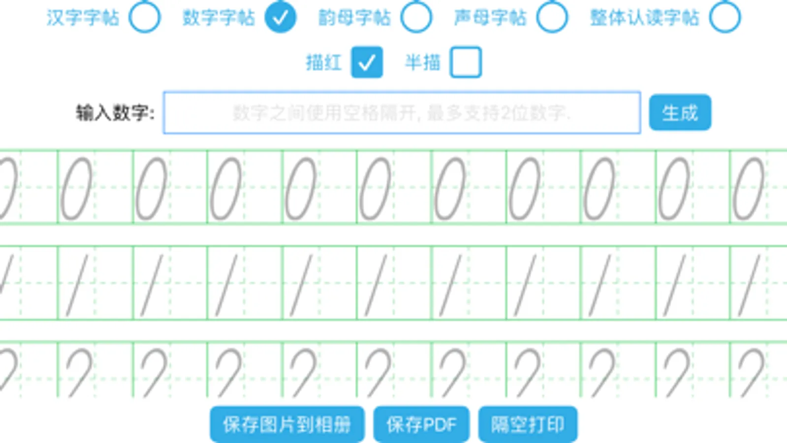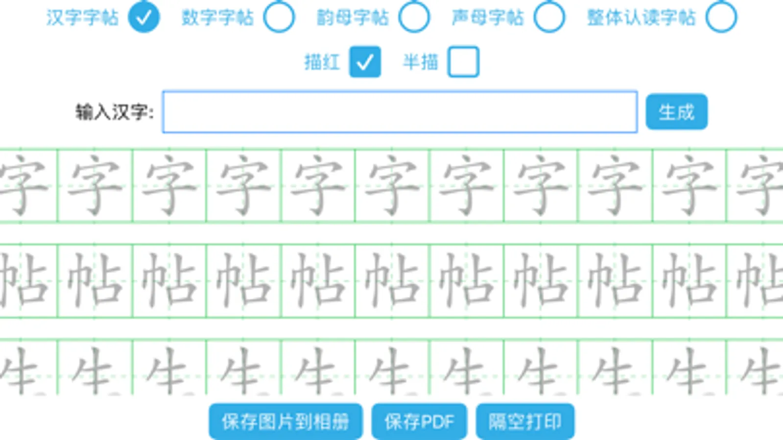 针对小学生, 生成汉字, 数字, 声母, 韵母, 整体认读等类型的字帖, 并支持全描红, 全临摹, 半描红设置.