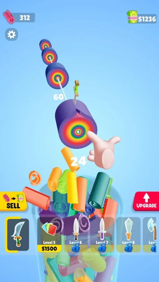 Click to shoot your knife. Cut the rolls layer by layer. Sell the pieces. Earn money. Upgrade your knife. Start over and over.