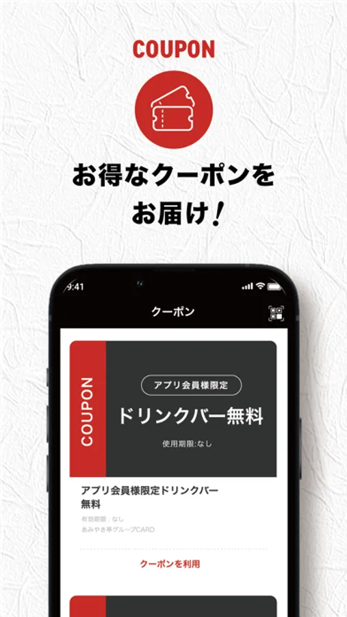 使用するクーポンをスタッフにご提示いただくとご利用いただけます。(スタッフが店舗コードを入力しクーポン利用ボタンを押します)。