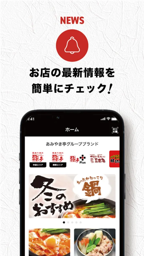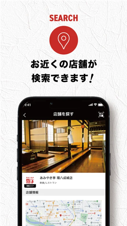 店舗検索機能で最寄りの「国産牛焼肉 あみやき亭」「和牛食べ放題 あみやき亭Plus」「元祖やきとり家 美濃路」「ホルモンとタンとカルビの専門店 ほるたん屋」「しゃぶ亭ふふふ」「焼肉食べ放題 感激どんどん」が簡単に見つけられます。