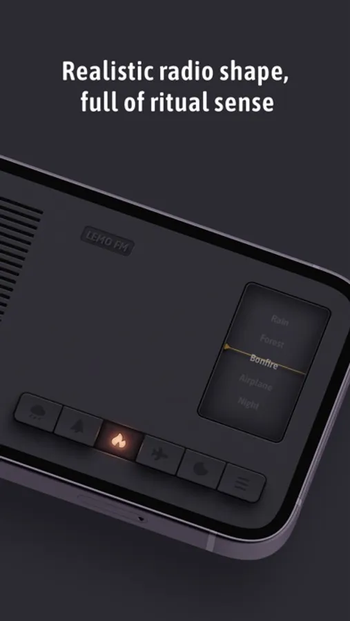 "LEMO FM" is a white noise App inspired by radios. Its design is just like a real radio, playing a variety of classic, high-quality white noise, such as rain, bonfires, forests, etc. Under the skeuomorphic interface, clicking the button will provide mechanical sound and vibration feedback, just like pressing a real radio button. Skeuomorphism is the most distinctive visual feature of LEMO FM, but behind skeuomorphism, we pursue simplicity and elegance in operation.