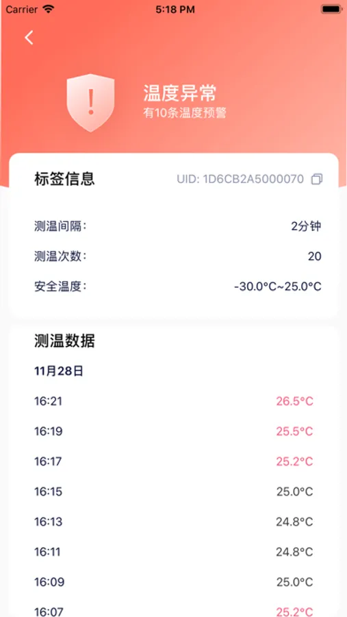 通过RFID读取智慧测温标签,可查看标签信息、测温数据。