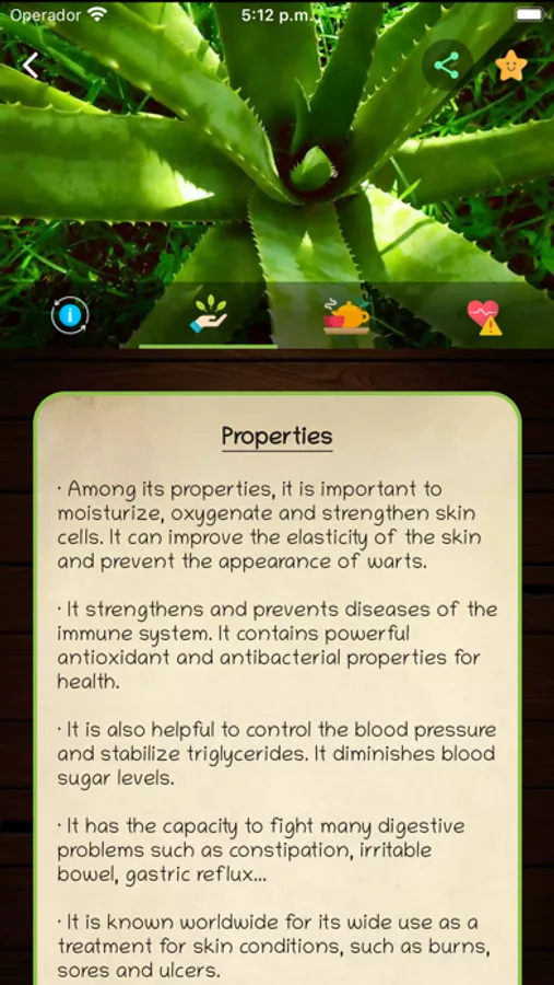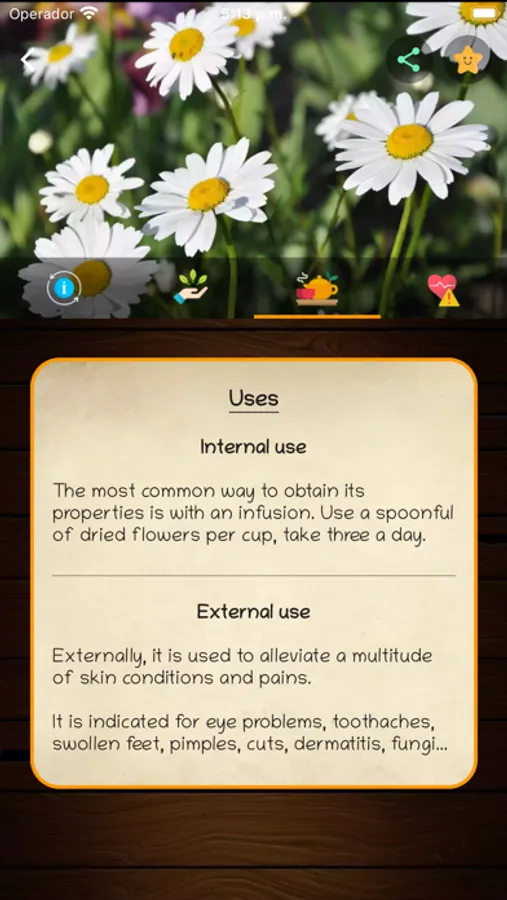 · Medicinal plants: In the second tab you will find a list with all the medicinal plants available. You will be able to know its therapeutic properties, uses and precautions that you must take into account before using them. You can access the information sheet by making a simple tap on a plant.