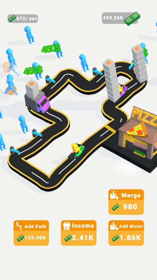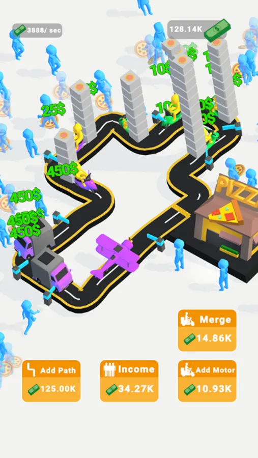 Deliver to the hungry customers the pizza. Get more and more customers add new motors and merge them for better motors. Expand your territory for more cash wider audience. You can double your earnings, revenue by clicking on the screen.
