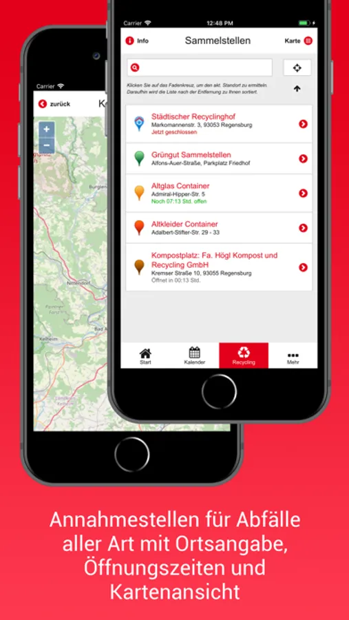 * Annahmestellen für Abfälle aller Art mit Ortsangabe und Öffnungszeiten, inkl. Kartenansicht und Navigation.