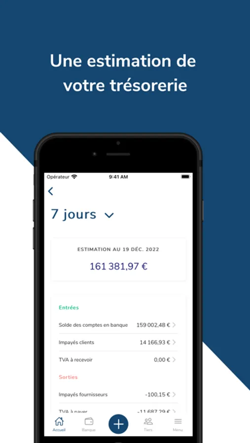• Sur base de vos entrées et sorties prévues, MonComptable app estime l’état de votre trésorerie à 7 jours, 14 jours ou la fin du mois ;