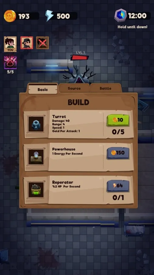 Do your gold and gem economy. There are 3 other players who want to survive by hiding in the rooms and there is one monster. The monster really wants to break down the doors. Buy a turret, upgrade your door, then monster has to run away!