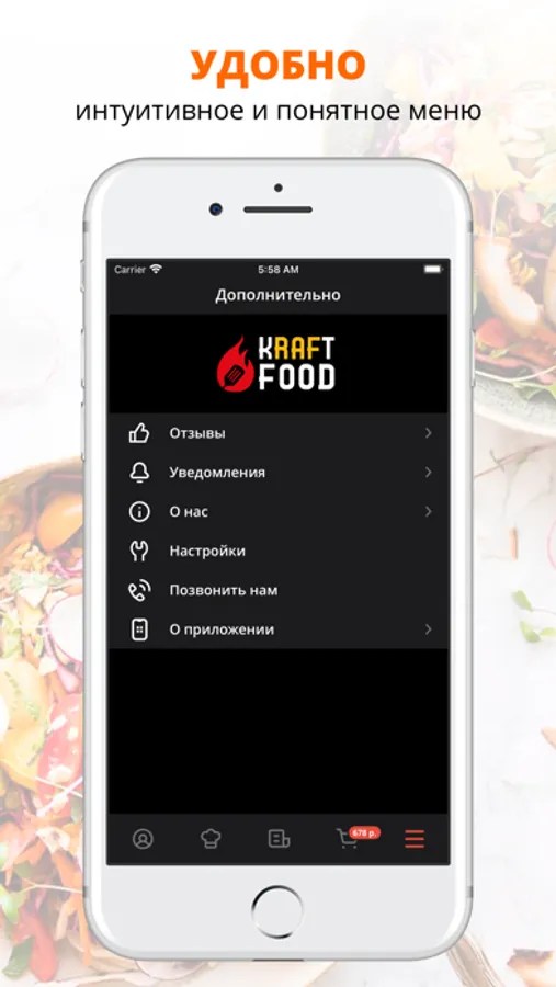 Приложение KRAFT FOOD — это удобный способ заказа еды домой или в офис! Мы готовим наши блюда из качественных свежих ингредиентов и доставляем еду быстро и бережно.