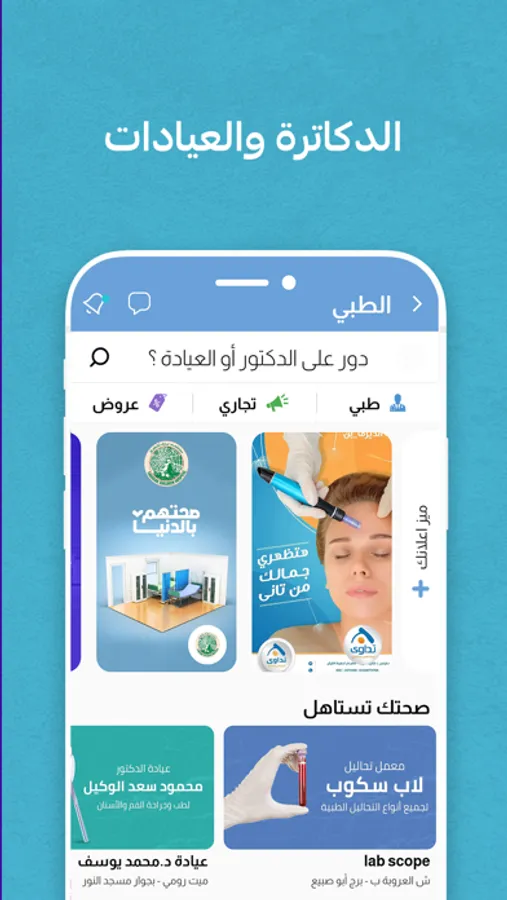 و بس تدخل القسم الطبي هتلقى كل التخصصات و تشوف كل العيادات و هتلاقي عروض كتيرة .