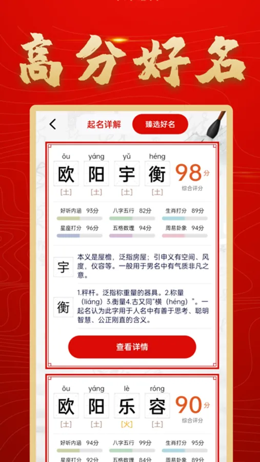 【起名宝典】高分名字一般来源于《诗经》、《楚辞》、《五代·花间集》、《五代·南唐二主词》、《唐诗》、《宋词》、《经典名句》、《成语典故》,易起名取名大师还结合了五行、命理、运势国学文化、生辰、五行喜忌神、卦象、生肖喜忌、诗词歌赋、流行/重名程度、名字音律还运用了AI技术分析辞海、康熙字典、古籍诗词等进行综合筛选起名;