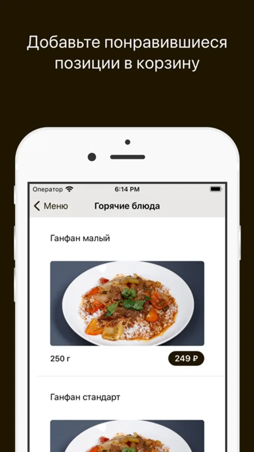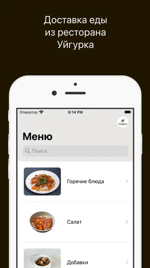 Как сделать заказ в приложении “Уйгурка”: выберите понравившиеся позиции из меню, добавьте их в корзину и перейдите на экран оформления заказа (по нажатию на иконку корзины).