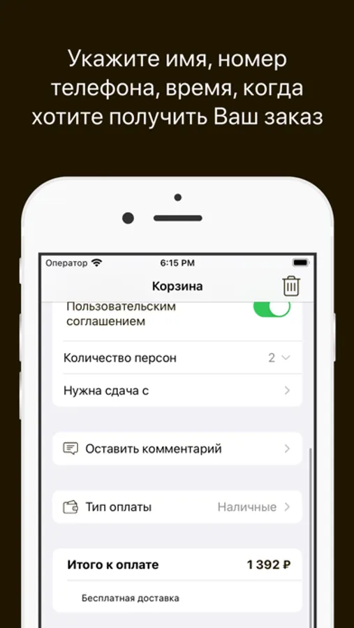 Укажите время, когда хотите прийти за своим заказом или выберите доставку с указанием времени и адреса доставки.