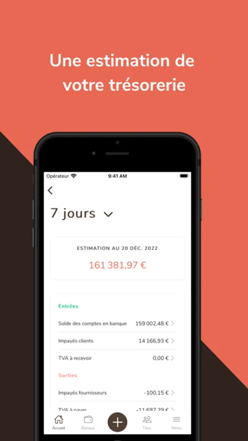 • Sur base de vos entrées et sorties prévues, Deg & Partners app estime l’état de votre trésorerie à 7 jours, 14 jours ou la fin du mois ;