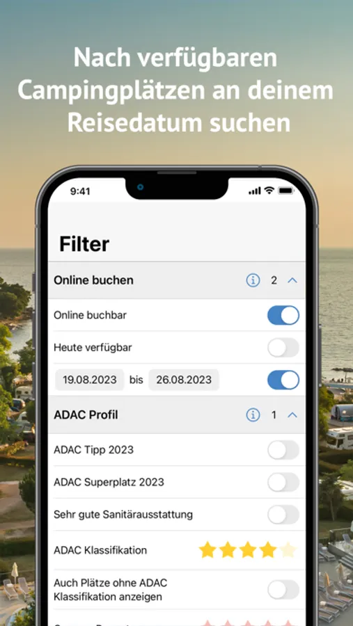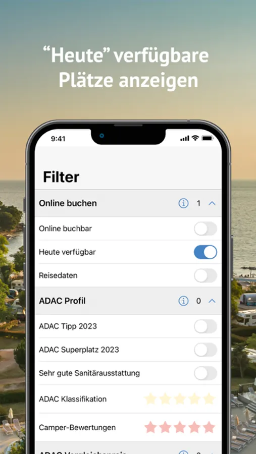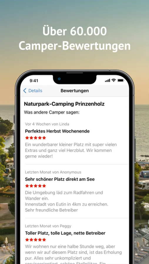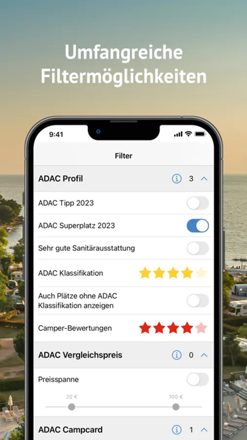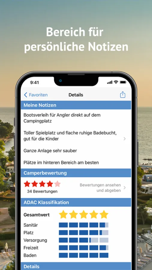 Zudem finden sich in der App, als ideale Ergänzung zur ADAC Klassifikation, über 60.000 persönliche Erfahrungsberichte anderer Camper. Mit Hilfe beider Bewertungen ist der nächste Traumplatz im Handumdrehen gefunden.