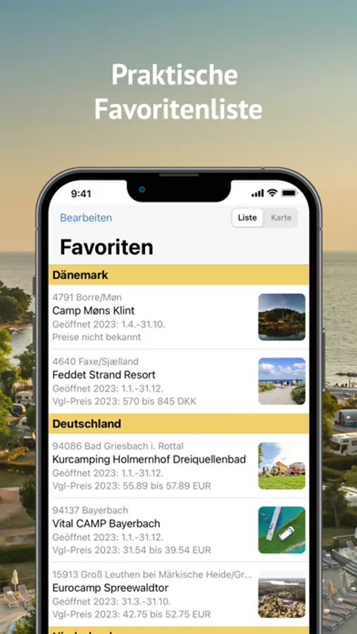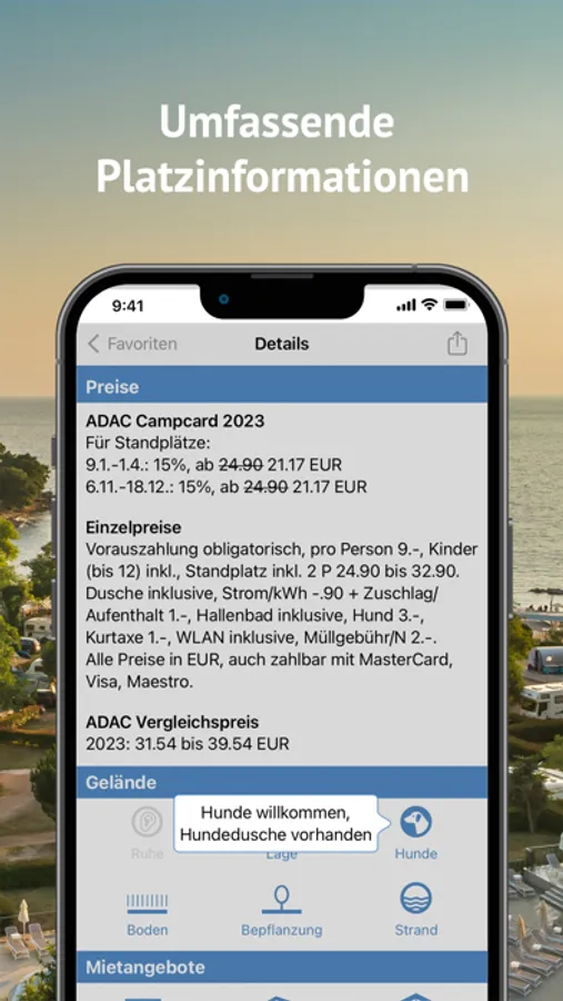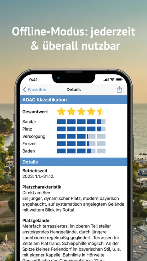 + Offline-Betrieb: Die Favoritenfunktion sowie Bilder, Beschreibungen und Ausstattung von Plätzen können auch ohne Internetverbindung genutzt werden
