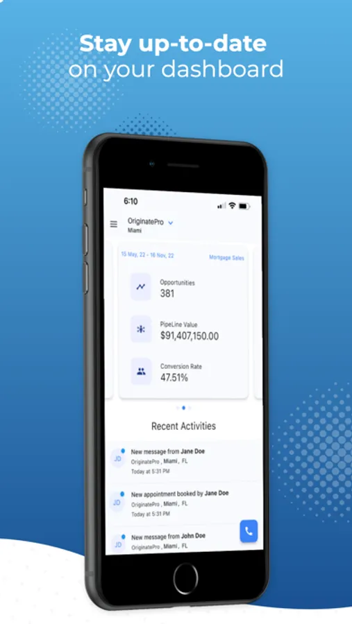 OriginatePro is a complete centralized comprehensive mortgage CRM that will help you close more loans faster with less hassle, streamline your workflow, and increase your productivity. Whether you are in your office or on the go, the OriginatePro mobile app is always with you, helping you engage with your borrowers.
