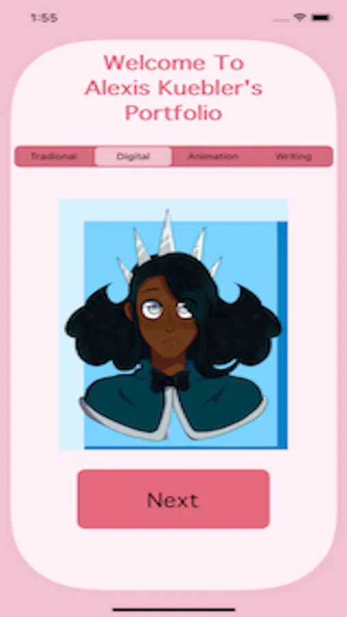 This app shows off digital art, traditional art, animation, and even a few writing pieces by Alexis. It also has a graffiti feature, so you can draw all over my work. Yes, I am putting way too much time into my portfolio