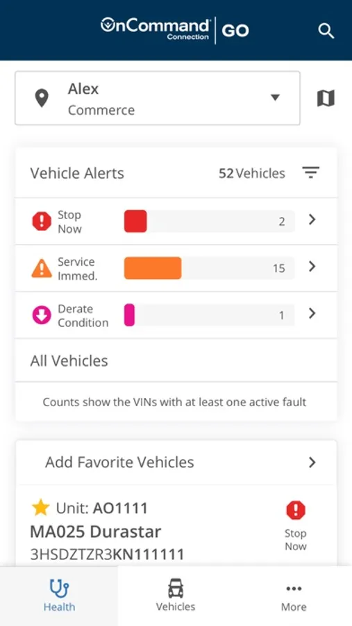 2. A summary of fault alerts across one or more vehicles, including severity of each