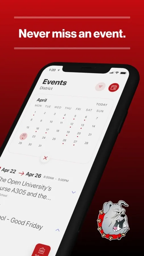 The event section shows a list of events throughout the district. Users can add an event to their calendar to share the event with friends and family with one tap.