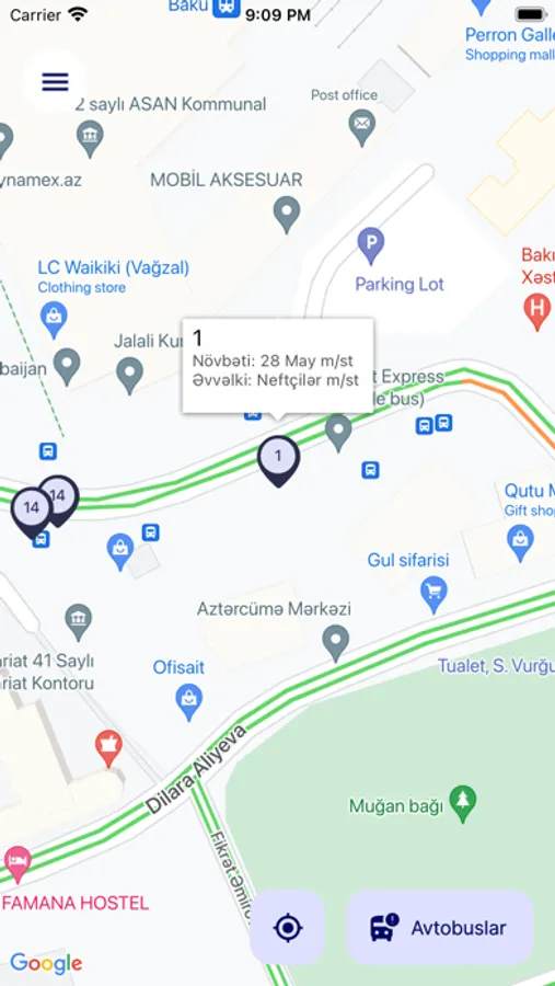 Tətbiqdən istifadə edərək BakuBus, Xaliq Faiqoğlu və digər avtobuslarının xəritədə yerlərini izləyə bilərsiniz. Bundan əlavə olaraq tətbiq xəritədə sizin öz olduğunuz yeri də göstərərək avtobusların yerlərini təyin etməkdə sizə köməklik edir.