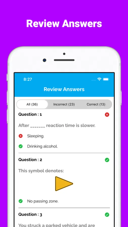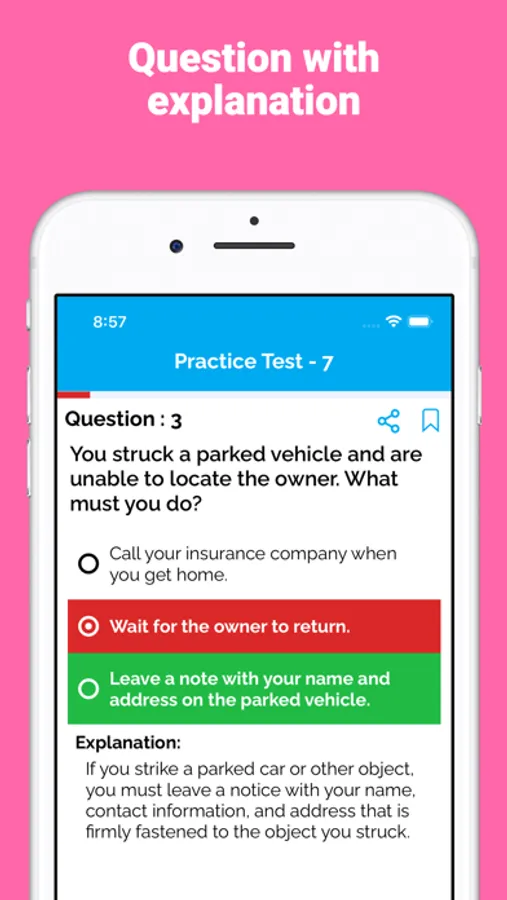 Our app includes a variety of practice questions for the Driver's license exam for Car, Motorcycle and Commercial Vehicles. These questions are based on the official handbook of different states.