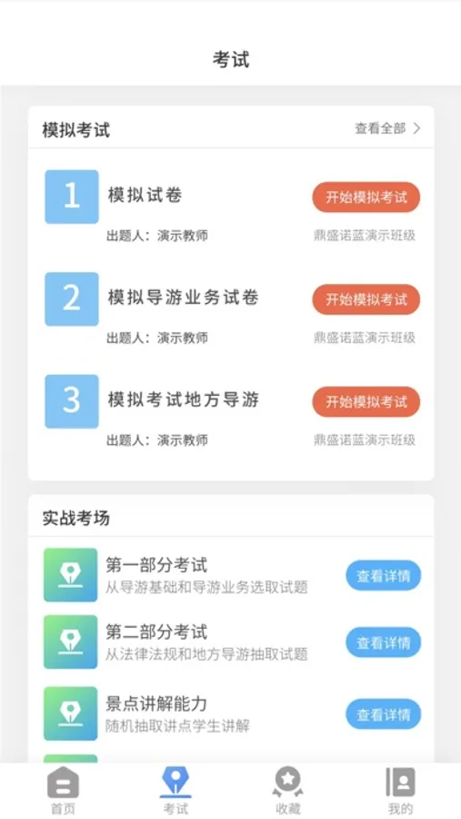 北京鼎盛诺蓝科技有限公司以导游的专业基础知识、岗位技能和职业素养为核心出发点,以历年实际案例试题为基础,在行业专家和资深导游的指导下研发了《鼎盛诺蓝导游证考试模拟系统》。教师可以在系统中进行试题的发布和上传,学生可以根据教师安排和自身学习进度进行日常联系和模拟考试,通过系统中的实训操作,可以让学生对导游岗位的理解更深刻,也为将来的实际导游证书考试打下良好的基础。 系统特色功能: 1、系统支持题库内容分章节、批量导入,便于教师维护题库内容; 2、系统提供科目一至科目四的专家辅导视频,学生可在线观看学习; 3、系统具备自动评卷功能,系统可以对学生试卷进行自动评阅并进行统计。 4、系统特有科目五景区讲解功能,提供考试景区720度全景景点、全景视频、图片等展示的方式,让学院置身于景点之中游走讲解,用多种方式展示内容强化记忆。
