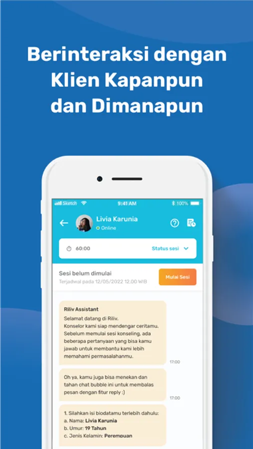 Terkadang kita mengalami situasi yang sulit, namun kamu tidak perlu menghadapinya sendirian. Riliv menyediakan layanan konseling psikolog online profesional langsung dari genggaman tangan. Tanpa perlu keluar rumah, mulailah bercerita sepuasnya secara anonim dan rahasia. Semuanya dengan harga yang terjangkau sesuai kebutuhan kamu.