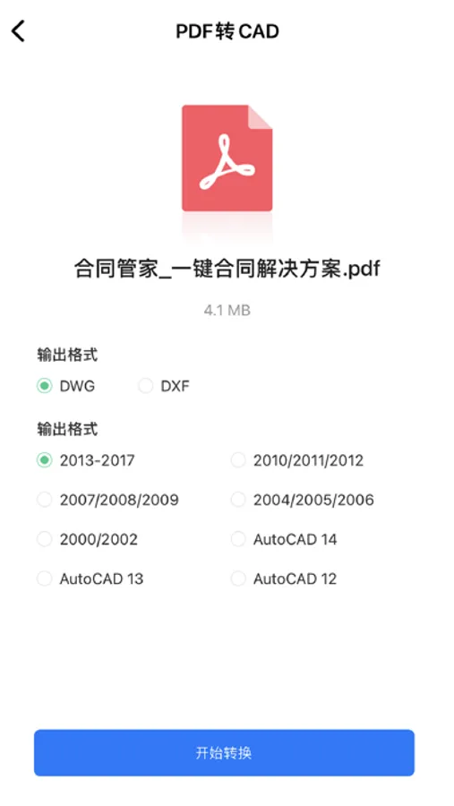 CAD转换器是一款提供CAD图纸文件格式转换的办公应用。可应用于日常生活中的大部分CAD图纸转换。可一键完成CAD文件与PDF、图片以及CAD各版本的格式转换。
