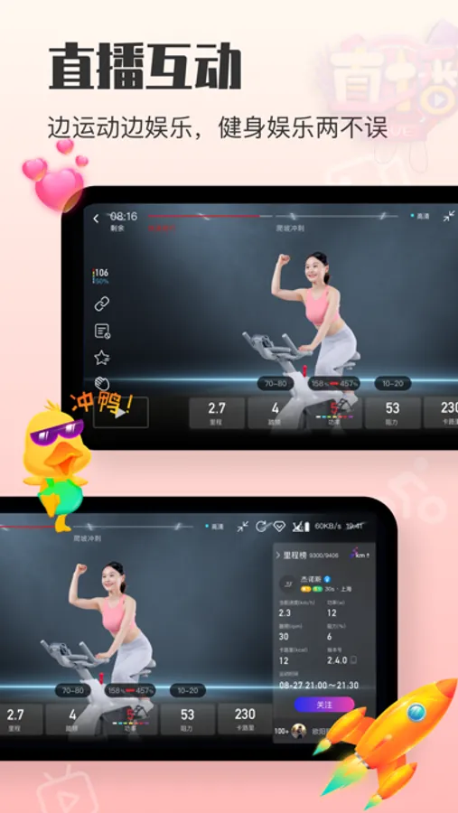 亿健运动app健身类直播app,通过教练在线专业指导,训练过程互相点赞鼓励,聊天,真正实现用户居家健身。app中提供几千节单车、跑步机、椭圆机、划船机、跳绳等器械课程,同时提供舞蹈、瑜伽、徒手等非器械类课程,满足用户居家健身的多样化健身需求。训练过程,教练通过运动数据,实时查看您的个人运动数据并给予专业的指导。同时,app中也提供了各类模式训练,智能训练及自由运动,让运动更加丰富。