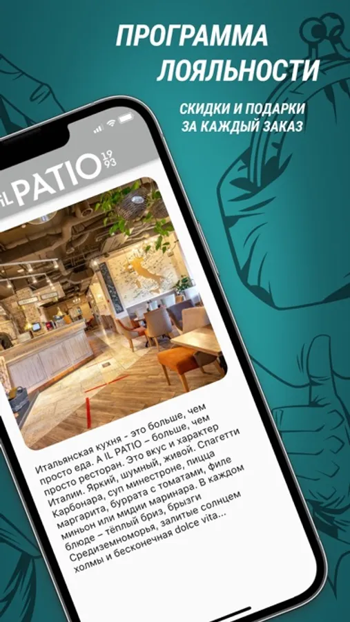 Скачайте приложение "IL PATIO" и заказывайте еду в ресторане в г. Душанбе с доставкой на дом, в офис или на вечеринку или забирайте блюда навынос.
