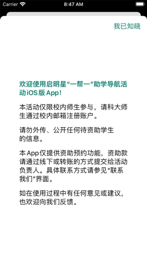专为中国科学技术大学启明星服务团“一帮一”助学导航活动开发的APP,支持线上查看、预约定向资助或不定向资助等功能
