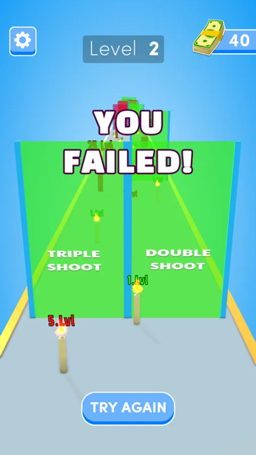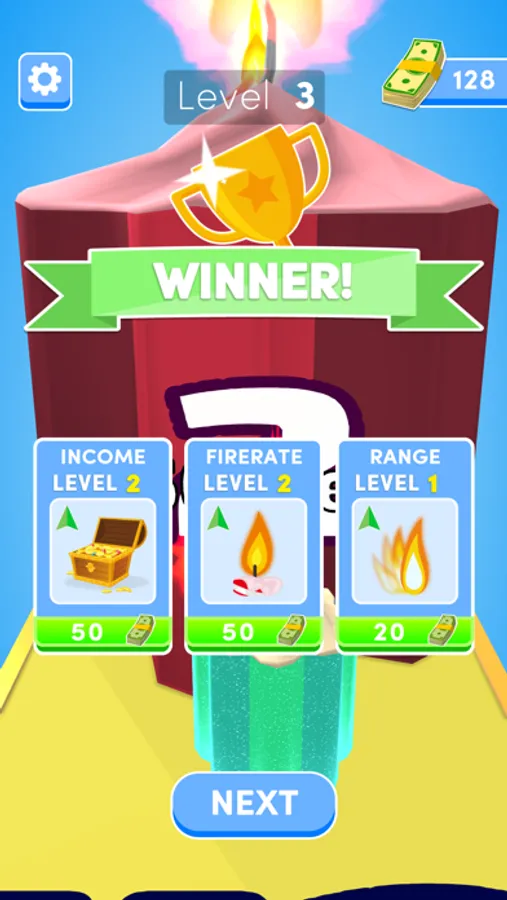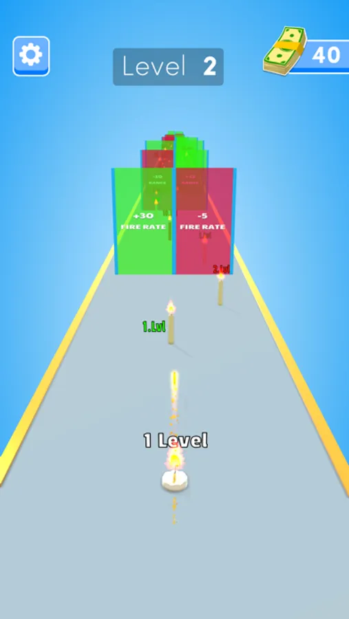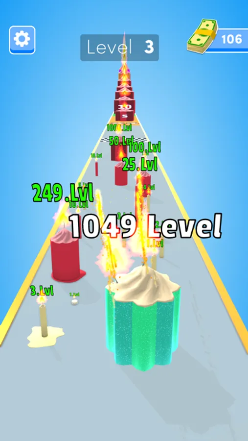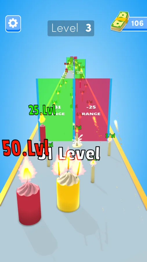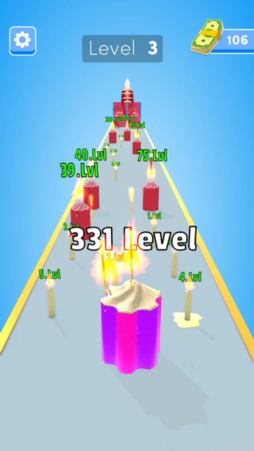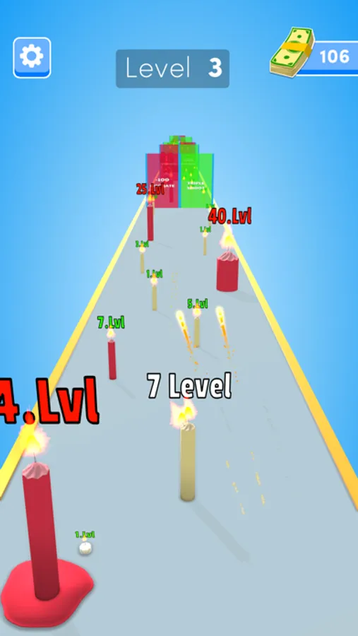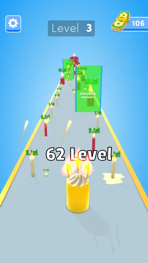Shoot the enemy candles on the path to reduce their levels. Reach to the finish line by leveling up and picking up bigger candles.