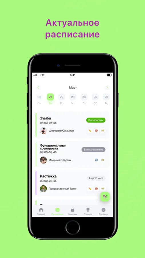 - Посмотреть актуальное расписание тренировок;