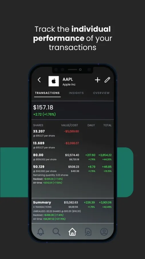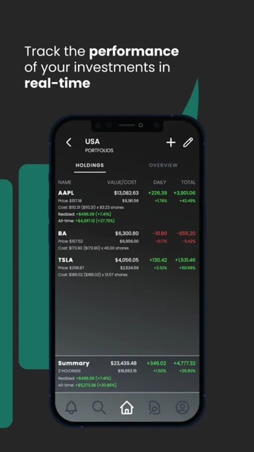 ‣ View your performance with realized, unrealized, daily and total metrics.