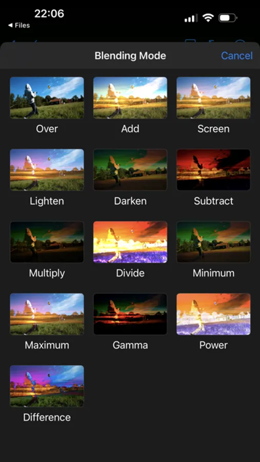 Blending modes: add, subtract, multiply, divide, screen, lighten, darken, minimum, maximum, gamma, power and difference.
