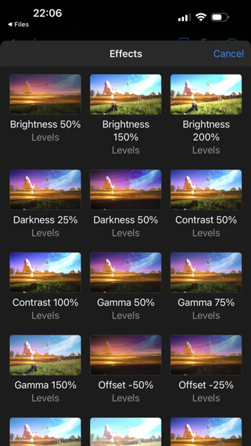 Effects: levels (brightness, contrast, invert), color shift (hue, saturation), blur, transform, kaleidoscope, corner pin, chroma key (green screen).