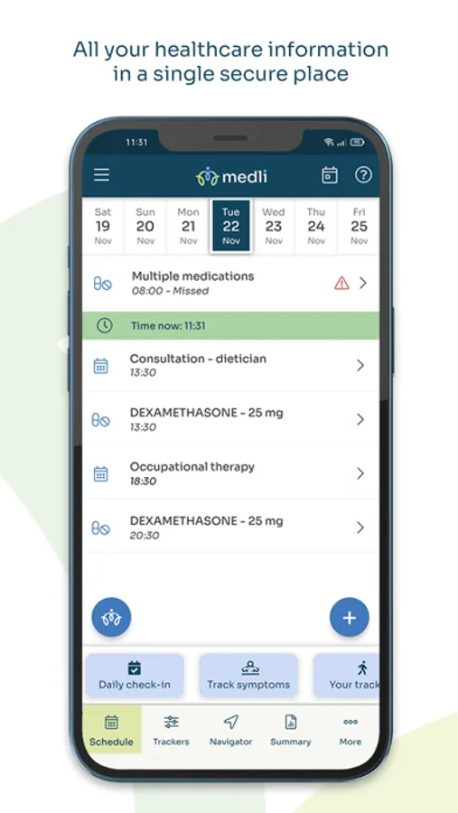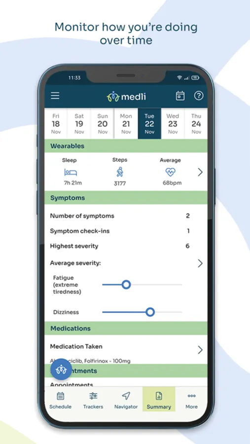 Medli offers you a simple, intuitive App to help you stay in control. Record your treatments, appointments, medications, symptoms and side effects in one safe, secure place. Manage each of your conditions in a single App. Connect to Apple Health and other wearable devices, create your own trackers, decide what you want to measure, so that you can live your best life.