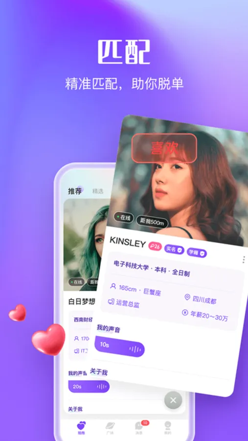 每日匹配优质青年,名企青年、名校精英、海归创业者、医生公务员…满足你的精挑细选。