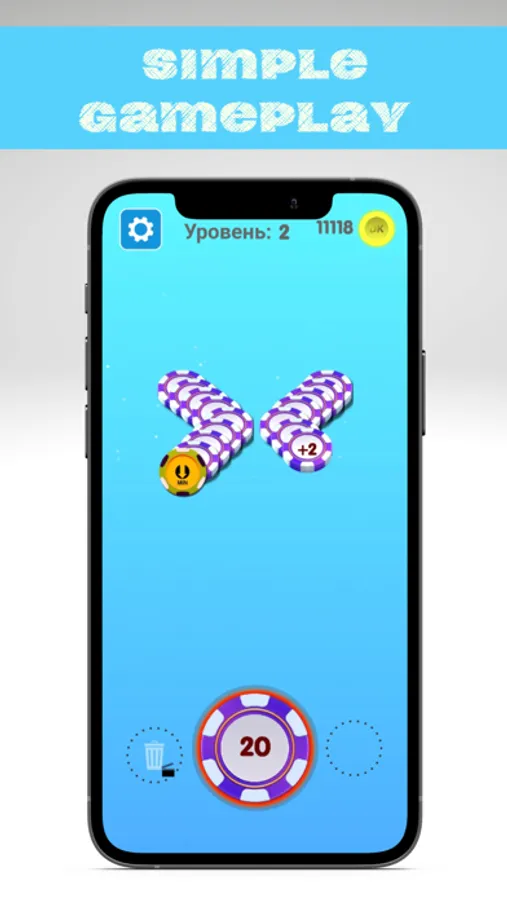 The game is similar to Blackjack 21 but slightly different. It is necessary to collect all the chips on the field and keep the total points between 0 and 21, the task is to use up all the chips. After winning, DC coins are credited to these coins, you can open new chips.