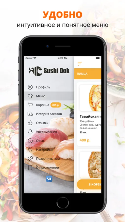 Приложение Sushi Dok — это удобный способ заказа еды домой или в офис. Вы всегда будете в курсе актуальных акций и спецпредложений. В нашем меню вкусные роллы, пицца, салаты и другие блюда.