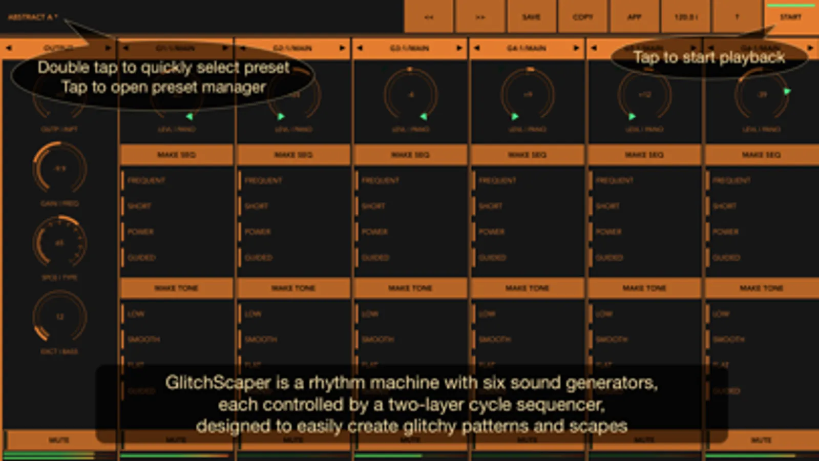 GlitchScaper is a rhythm machine with six sound generators, each controlled by a two-layer cycle sequencer, designed to easily create glitchy patterns and scapes.