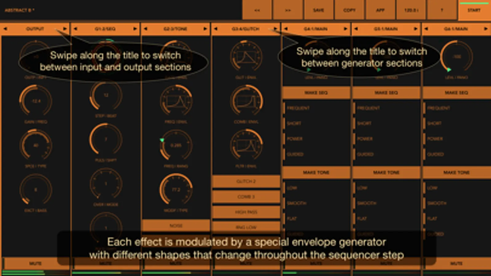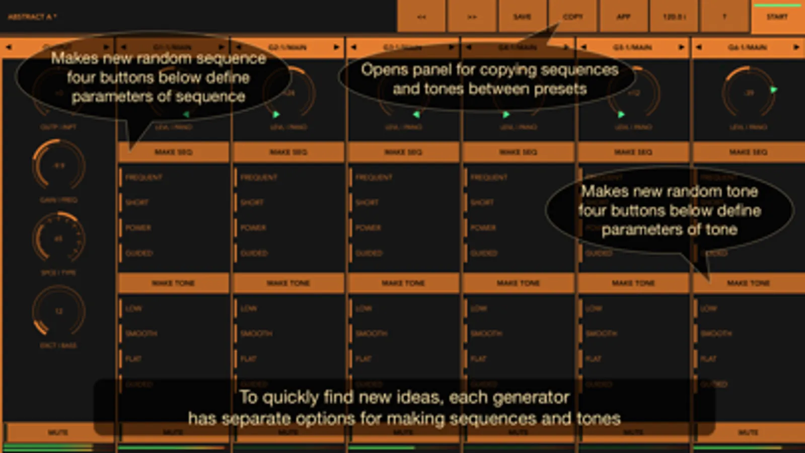 To quickly find new ideas, each generator has separate options for making sequences and tones. The parameters of the new sequences and tones are set randomly, but are guided by several user-defined options, which in outline define the steps of the sequence and the type of tone or noise. This allows you make a quick draft of a pattern and then simply tweak it to get the final sound. The advanced copy function gives you ability to quickly make a new preset by copying sequences and tones from existing ones.